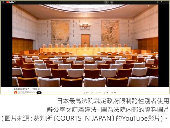 July 12, 2023, https://www.nbcnews.com/news/world/japan-court-ruling-transgender-toilet-limits-rcna93805https://asia.nikkei.com/Spotlight/Society/Japan-top-court-rules-against-ministry-s-transgender-toilet-rules;〈日本最高法院歷史性判決 限制跨性別員工使用廁所違法〉,《自由時報》,2023年8月15日。https://news.ltn.com.tw/news/world/breakingnews/4360707(最後參閱日期:2023年9月13日)。
