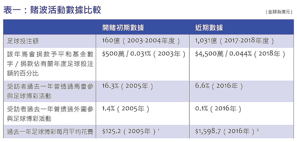 [10] 有關金額是在2005年調查時,調查機構向12至19歲的受訪者查詢他們在過去一年,每月參與足球博彩活動消費的金額;“Study on Hong Kong People’s Participation in Gambling Activities (2005),” Prepared for Home Affairs Bureau by Social Sciences Research Centre, The University of Hong Kong, accessed September 6, 2018, https://www.hab.gov.hk/file_manager/en/documents/whats_new/gambling/KeyS...