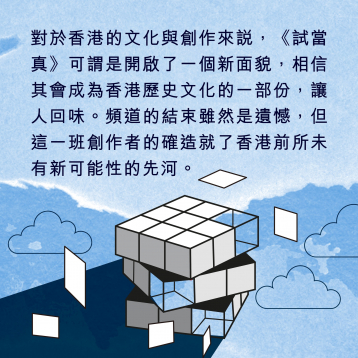 《試當真》頻道於2020年10月26日由游學修、許賢以及蘇致豪以「試下認真,認真試下」為主要理念創立,其中開展了「試玩毛」、「拍住先」等系列。頻道開初,已有不少既寫實且搞笑的突破性創作,而筆者則對《咁大件事冇人講》最有印象,因實在沒有多少的創作能讓人感到如此有共鳴,其他的節目,筆者就不在此多加講述了。對於香港的文化與創作來說,《試當真》可謂是開啟了一個新面貌,相信其會成為香港歷史文化的一部份,讓人回味。頻道的結束雖然是遺憾,但這一班創作者的確造就了香港前所未有新可能性的先河。