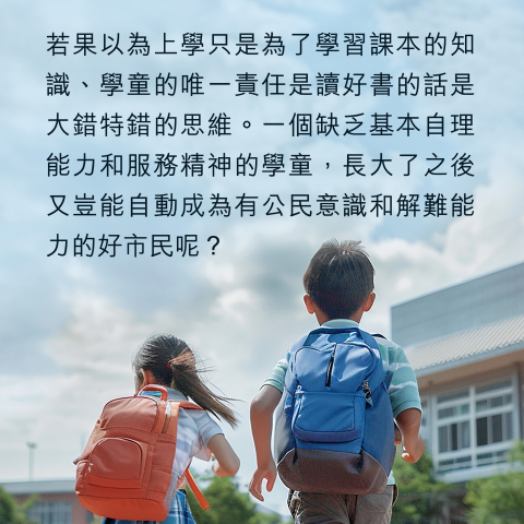 期望學校和家長為了學童的長遠利益著想,應鼓勵/要求他們承擔更多責任和服務,多做家務(特別是有外傭的家庭)和在學校參與課室和校園的清潔和秩序管理。若果以為上學只是為了學習課本的知識、學童的唯一責任是讀好書的話是大錯特錯的思維。一個缺乏基本自理能力和服務精神的學童,長大了之後又豈能自動成為有公民意識和解難能力的好市民呢?