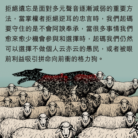 拒絕遺忘是面對多元聲音逐漸減弱的重要方法,當掌權者拒絕逆耳的忠言時,我們起碼要守住的是不會阿諛奉承,當很多事情我們愈來愈少機會參與和選擇時,起碼我們仍然可以選擇不做個人云亦云的愚民,或者被眼前利益吸引拼命向前衝的格力狗。而作為信仰群體,我們應常常記著:「你們的話,是,就說是;不是,就說不是;若再多說就是出於那惡者。」(太五37 )