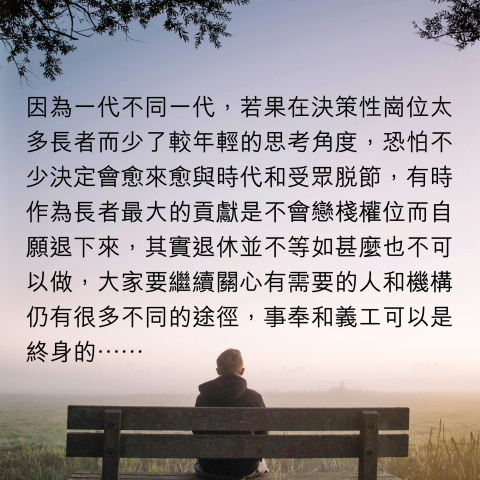 至於一些帶領性的職位,無論是教會和機構的領導層、或是政府官員和立法會議員,毋須太早(如60歲)退固然有道理,但亦不宜太遲(如70歲)都不退,因為一代不同一代,若果在決策性崗位太多長者而少了較年輕的思考角度,恐怕不少決定會愈來愈與時代和受眾脫節,有時作為長者最大的貢獻是不會戀棧權位而自願退下來,其實退休並不等如甚麼也不可以做,大家要繼續關心有需要的人和機構仍有很多不同的途徑,事奉和義工可以是終身的,在自己神志和體力仍在狀態時退下來,而不是被人厭棄才不情願地「被退休」,應該是所有過了知天命和耳順之年的人應有的智慧。